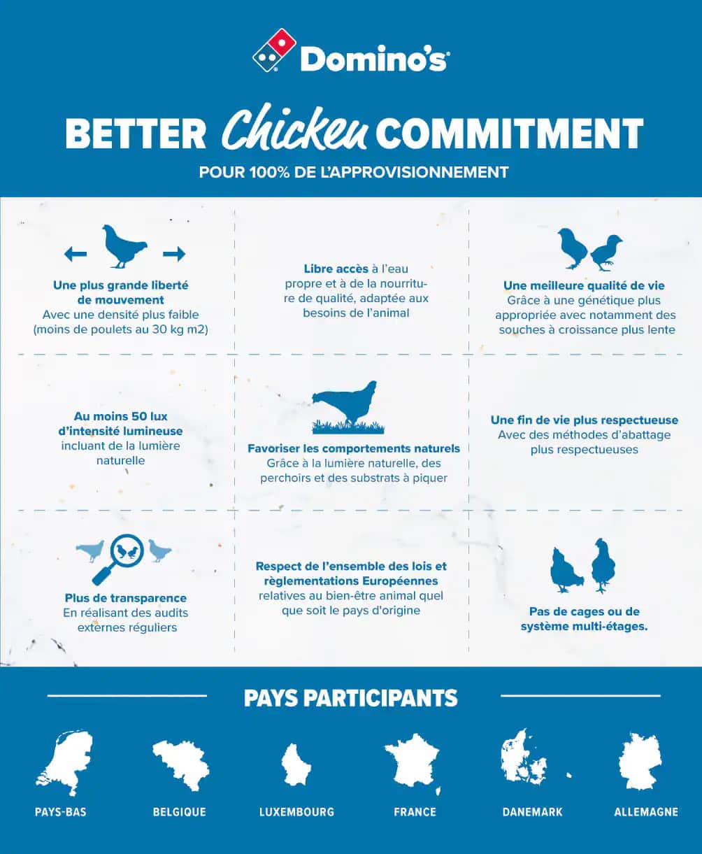 En 2020, Domino's Belgique et Luxembourg a adhéré à l'engagement "Better Chicken". En signant l'Engagement pour le poulet, Domino's s'efforce d'améliorer les normes de bien-être des poulets. Pour en savoir plus sur l'engagement pour un meilleur poulet, cliquez ici et pour en savoir plus sur l'engagement de Domino's, cliquez ici.