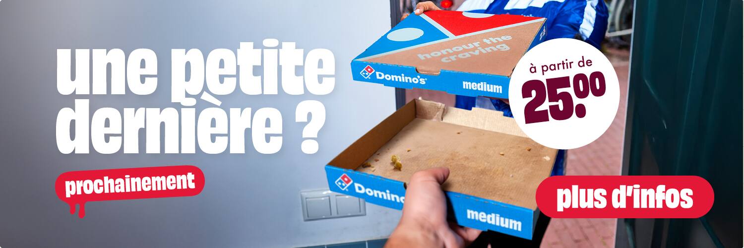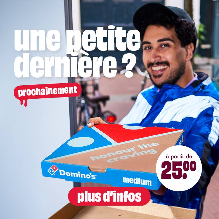 Bientôt chez Domino’s : les pizzas livrées à volonté ! Faites-vous livrer des pizzas regular à volonté pour 25 € à peine. Et tout ça pendant 2 heures.Vous avez faim ? Alors craquez complètement. Encore une pizza. Et une autre. Allez, une petite dernière. Parce que tant que le chrono tourne, nous continuons à livrer.