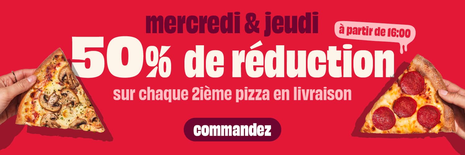 Les mercredis et jeudis, Domino's vous propose une offre spéciale en milieu de semaine. Si vous commandez après 16 h, vous bénéficiez d'une réduction de 50 % sur chaque deuxième pizza de votre commande. Idéal pour passer une soirée agréable à la maison, pour un repas facile après le travail ou simplement parce que vous avez envie de vous faire plaisir.