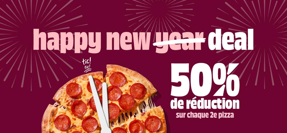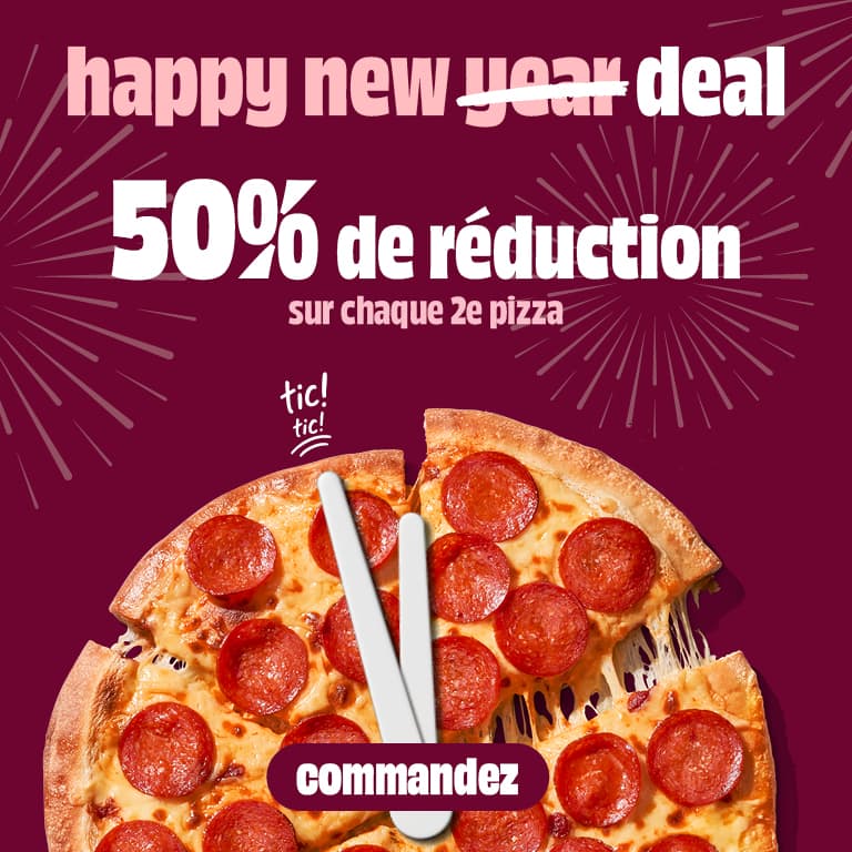 Commande cette semaine et profite de 50 % de réduction sur chaque 2ᵉ pizza, en retrait comme en livraison.