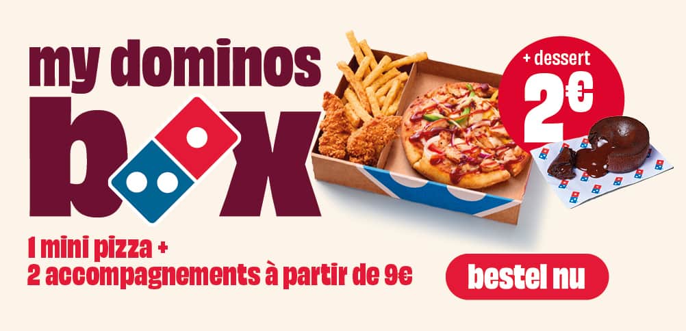 Conditions pour les coupons: un montant minimum de commande peut être appliqué pour livraison. Coupons ne peuvent pas être combinés. Promotion sulement valables sur www.dominos.be. Plus d'informations sur https://www.dominos.be/fr/offres-du-moment/conditions-codes-de-r%C3%A9duction