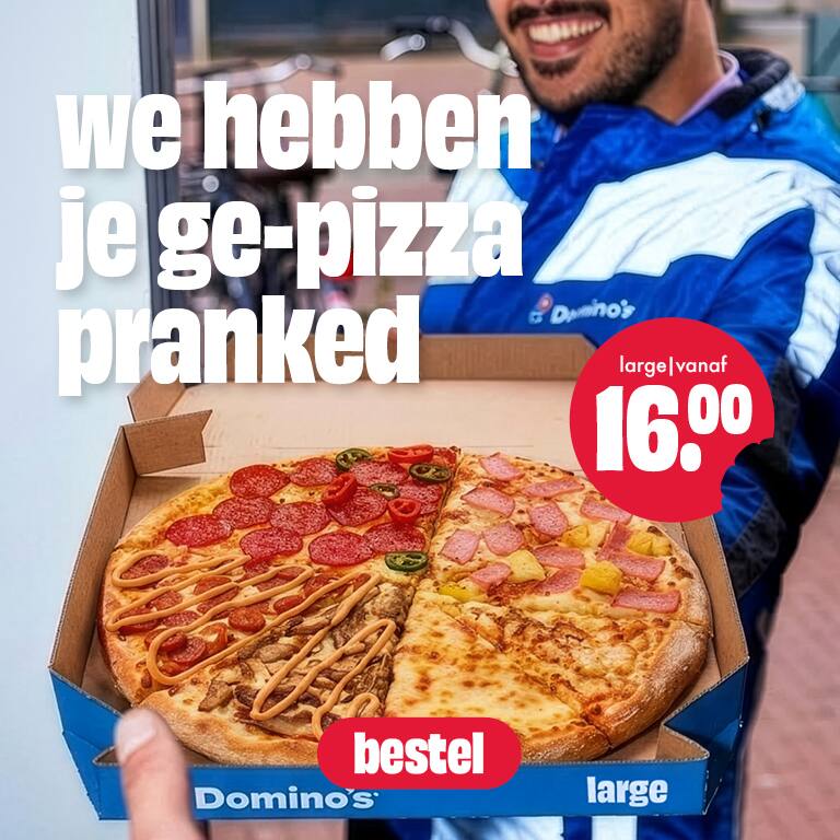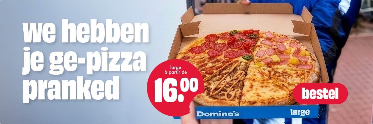 Een kleine grap, maar een serieuze beloning. Deze pizza bestaat uit: Pepperoni, Spicy Pepperoni, Ham, Hawaii, Chicken, Cheese, Kebab en Merguez.