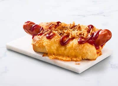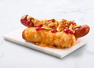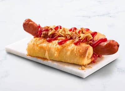 The best of both worlds ๐+๐ญ. Pizzadeeg gevuld met een hotdog, tomatensaus, Gouda en cheddar kaasmix, crispy onions en een swirl van ketchup, mosterd of BBQ saus ๐คคย